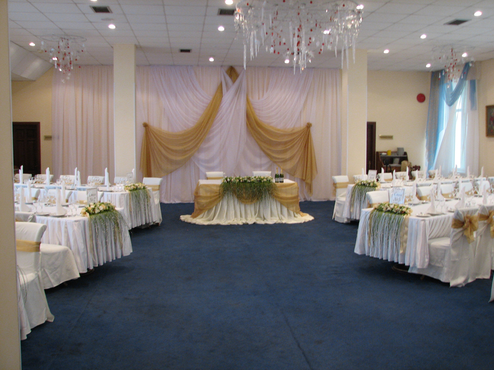 Традиционное оформление для этого ресторана не подойдет. Великолепно смотрелись бы роскошные деревья, декорированные живыми цветами, кристаллами и свечами...На президиуме парящая композиция на каркасе...