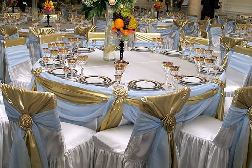 Традиционное оформление для этого ресторана не подойдет. Великолепно смотрелись бы роскошные деревья, декорированные живыми цветами, кристаллами и свечами...На президиуме парящая композиция на каркасе...
