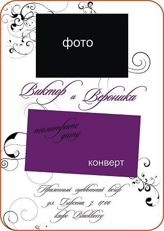 я тоже сама делаю приглашения.. точнее вот уже третий их вариант))) на первой картинке - фото из интернета (в конверт вкладывается дата свадьбы. нанизанная на ленточку) на второй - мой пока еще макет. конверты я уже сделала. осталось романтическую фотку и распечатать (оранжевого края не будет, это для обрезки; еще думаю, что может вместо возни с ленточками вложить бумажку с датой свадьбы, какой-нибудь дизайнерский картон просто возьму)
