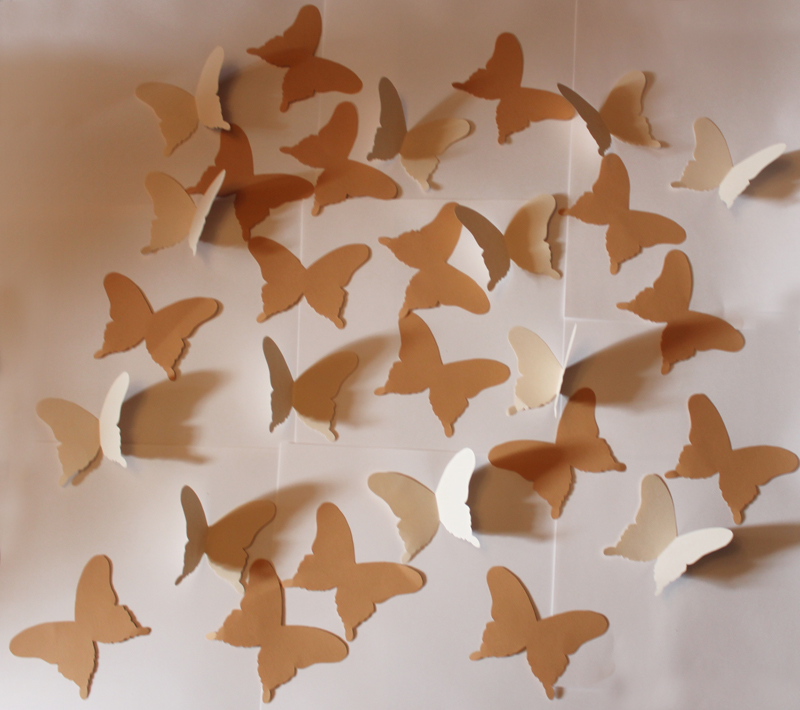 Вот и решила я за месяц всё то сама сделать. Пока что вырезала около 30 бабочек (ниже фото). которые сверху хочу покрыть золотыми блёстками и на них же писать имена. Вот только не знаю, где взять такие блёсточки. Есть один вариант: найти лак для волос с блёсточками и попробовать, что получится..