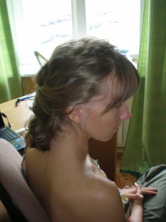 я встретилась со своей девочкой-парихмахером и мы пока ничего не решили, остался вопрос как же укладывать волосы мы пробовали делать аля косу из подкрученных волос и французскую косу, второй вариант смотрится классно сзади и сбоку, а спереди не очень, но самый большой ворос, что делать с фатой - если крепить сверху шпильками, будет закрыта вся красота прически, но ее можно будет легко убрать на первый танец (у нас же постановочный), а если фату крепить внутрь прически, чтобы открыть прическу, то естесственно ее не вытащишь во время танца (а она наверное будет мешать и болтаться)