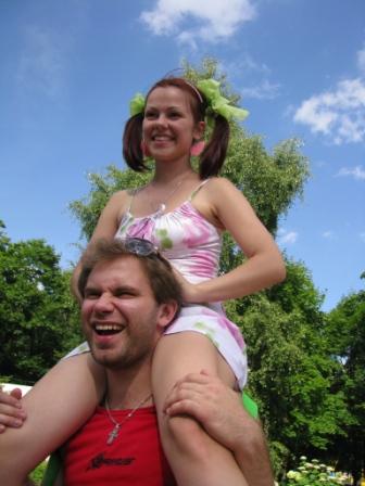 Кроха, ты спецом выложила фотку, на которой я так ужасно получилась?  Расскажу за Юльку чуть-чуть как это было ))) Сначала мы за несколько дней до этого перерыли у меня все запасы дочкиной детской бижутерии, все мягкие детские игрушки и т.д.  После отъезда Тохи и Крохи дома у меня был такой бардак, который даже моя детвора никогда не наводила  В воскресенье, в полной экипировке мы втроем поехали на метро в парк Челюскинцев (взглядами прохожих, естесственно, обделены не были)... Сидели, дурачились, обнимались с игрушками ))) Приехали в парк и к нам присоединились еще две "маленькие девочки" в гольфиках и с бантиками (поскромнее конечно чем наши, но тоже прикольно)  И пошли мы кататься на аттракционах, вспоминая детство ))) Покатались, прогулялись по парку, пофоткались... А потом... поплехались в фонтане в центре парка ))) Не дожидаясь, пока нас оттуда выгонят, мы пошли в Темпо. Посидели, поели, попили ))) Было и детское мороженое и взрослое пиво ))) После этого одна "малышка" предложила нам залезть на крышу недостроенного паркинга. Мы, зайдя в магазин и сделав запасы вина, пошли туда... Сначала немного застремавшись решили не лезть туда в таком виде, боясь нарваться на каких-нибудь неадекватных неформалов  Но потом любопытство взяло верх над разумом и мы все-таки полезли ))) Оказалось, народец там не такой уж и злобный, как нам казалось ))) Встретили нас на крыше с криками: "Привет, Союзмультфильм" ))) все были в шоке от такой 25-летней именинницы ))) Потусовались там немножко и разбрелись по домам... Ну как по домам  Я в тот вечер домой так и не вернулась, но это уже совсем другая история