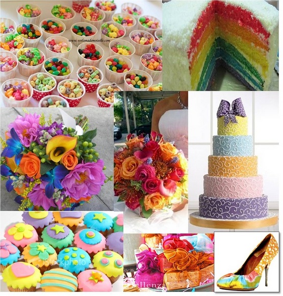 я думаю отличная идея про разноцветную свадьбу, как здорово будут смотреться бонбонки всех цветов радуги, цветные сладости и торт, сразу в голову пришли m&m's ) а подружки невесты могут не заморачиваться поисками платья определенного цвета, берут то яркое что уже есть и могут взять по букетику в цвет своего платья, будет здорово!