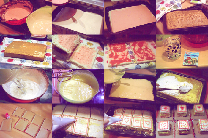 готовим бисквит: отделить белки от желтков, взбить белки с небольшим кол-ом сахара, отдельно взбить желтки с оставшимся сахаром. аккуратно добавить белковую смесь в крем из желтков, перемешать до однородного состояния, постепенно всыпать просеянную муку с ванилином и разрыхлителем. разделить бисквитное тесто на две части и в одну из них добавить красный краситель. вылить тесто на промасленный противень, сверху вылить цветное тесто и поставить запекать бисквит в горячую духовку (210C), не открывая шкаф духовой после того, как бисквит поднимется, снизить температуру до 170С. проверить готовность бисквита зубочисткой.