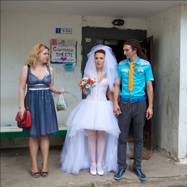 Следующий этап - выкуп. Знаю, что не все его делают, считаю слишком уж устаревшим действом, но я ни минуты не пожалела, что он был  Сидишь дома, точнее бегаешь по комнате в волнении, а с улицы доносится: Хочешь я в глаза, взгляну в твои глаза..иииии слова припомню все и снова повторю..  или когда пап забегает в комнату с бешеными глазами: Где карандаш?? есть карандаш??? он нос найти не может, пусть тогда рисует!!! и вот наступает тот самый момент.. я слышу, что открылась дверь (я ж супер-невеста - встречаю любимого спиной  ) и уже надо бы повернуться..и все как в замедленной съемке. сердце замирает, я поворачиваюсь, вижу его (он уже нависает надо мной).. и сердце галопом как паскочет!!!!!!!! народ кричит УРААА!! а мы тупа жмякаемся и рассматриваем друг друга  а ощущение такое, словно мы лет 100 не видились и в комнате только мы потом мы как-то расцепились, я вырвала букет, тк мой муж ну ооочень уж волновался и совершенно забыл его мне отдать быстренько в комнатку за стол. самое обидное, что как только родители начинали говорить слово, кто-то из соседей начинал сверлить  ну хождение с иконой, пусть тоже себя изживает, но я решила сделать) чтоб маму порадовать, хоть на практических всех фото она со слезами) когда вышли из подъезда, у меня отвисла челюсть: откуда столько людей собралось?? ну конфетки покидали - и в машинки))) каждый в свою) ненадолго