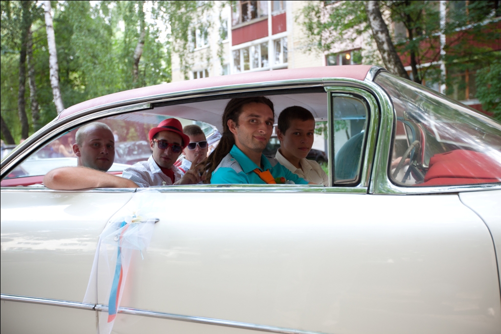 Следующий этап - выкуп. Знаю, что не все его делают, считаю слишком уж устаревшим действом, но я ни минуты не пожалела, что он был  Сидишь дома, точнее бегаешь по комнате в волнении, а с улицы доносится: Хочешь я в глаза, взгляну в твои глаза..иииии слова припомню все и снова повторю..  или когда пап забегает в комнату с бешеными глазами: Где карандаш?? есть карандаш??? он нос найти не может, пусть тогда рисует!!! и вот наступает тот самый момент.. я слышу, что открылась дверь (я ж супер-невеста - встречаю любимого спиной  ) и уже надо бы повернуться..и все как в замедленной съемке. сердце замирает, я поворачиваюсь, вижу его (он уже нависает надо мной).. и сердце галопом как паскочет!!!!!!!! народ кричит УРААА!! а мы тупа жмякаемся и рассматриваем друг друга  а ощущение такое, словно мы лет 100 не видились и в комнате только мы потом мы как-то расцепились, я вырвала букет, тк мой муж ну ооочень уж волновался и совершенно забыл его мне отдать быстренько в комнатку за стол. самое обидное, что как только родители начинали говорить слово, кто-то из соседей начинал сверлить  ну хождение с иконой, пусть тоже себя изживает, но я решила сделать) чтоб маму порадовать, хоть на практических всех фото она со слезами) когда вышли из подъезда, у меня отвисла челюсть: откуда столько людей собралось?? ну конфетки покидали - и в машинки))) каждый в свою) ненадолго