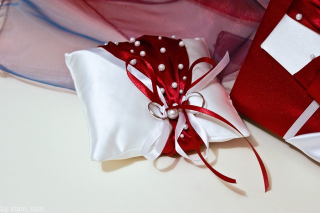 Девочки, смотрите какая идея про подушечку Можно ведь для любой свадьбы такую сделать. С рыбками или ракушками рисунок - для морской, из однотонной ткани - для цветной, для вампирской , напр. - из черной