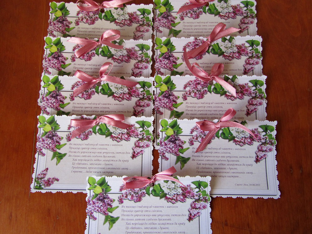 [/center] Перед свадьбой эта карточка для меня стала сюрпризом. Когда я написала стихотворение, муж был в восторге, а затем всю ночь сидел за компом над идеей карточки. На следующий день тайком распечатал, вырезал одну, украсил бантиком и преподнёс мне! Как же я была рада!