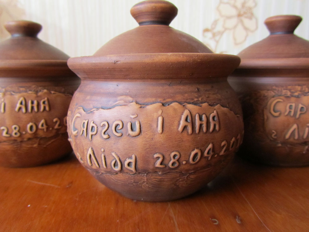 Немного выше я писала о глиняных горшочках, которые были вместо бонбоньерок. Вот и они. Мы с мужем очень обрадовались, когда впервые их увидели, т.к. представляли себе это намного проще. А мастер постарался на славу! Всё аккуратненько, колоритно, самобытно. Вчера попробовала в одном горшочке запечь мясо с кортошкой - отличненько! И кушать из него было очень приятно. Ведь именной. [center]