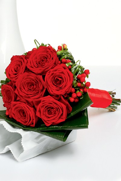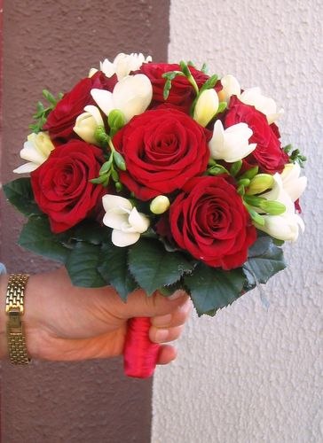По поводу букета. Я очень люблю розы. А, т.к. красный есть в наших основных цветах свадьбы, то хочу красные розы. Единственное, что вызывает у меня в этом плане сомнения, это то, что я побаиваюсь как бы букет не смотрелся красным пятном на фоне белого платья. Поэтому подумываю чем бы его разбавить. Букетик хочу маленький. Мне кажется, что я со своими параметрами (152 см рост и 37 кг вес) с большим букетом буду смотреться абсурдно. В inflowers.by мне сказали, что букет по моим требованиям будет стоить в районе 350-450 тыс. Кажется, розы мне считали по 25 тыс. Наверное, это не голландские все-таки Вот что-то такое мне и предлагали, только веточки (не знаю чего) зеленые, а не красные как на фото. Вложение:
