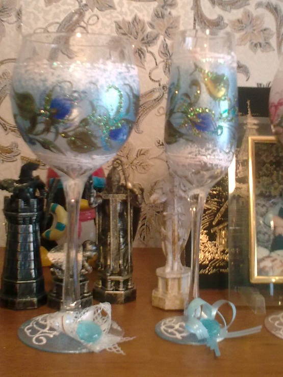 А мы свои бокалы купили в фирменном магазине Неман в ТЦ Столица. Отдали за оба что-то около 60.000 (бокалы стеклянные, но с узорами + фигурная ножка). Кстати там же купили и рюмочки для битья - 11.500. Бокалы украшала моя мама (она в принципе делала и другие аксессуары, все, кроме пригласительных). В украшении ленточки, фатин, бусинки, несколько страз. Все клеилось на прозрачный клей-момент, нигде никаких разводов клея нет. Получилось очень здорово. Держать удобно  А на счет помыть - можно аккуратно протереть влажной губкой внутри, а снаружи чуть влажной, или просто пыль смахнуть=) Было бы желание.