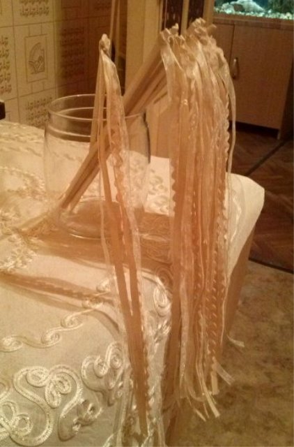 Ура-ура-ура,первая партия готова  Сделала 13 палок, осталось еще 27. Решила делать 40 штук) Итак, как это было))) 1. Купила ленты. Все бежевого цвета. Одну-волнистую, одну-атласную, одну-полупрозрачную. 2. Купила 2 упаковки палочек для суши. всего получилось 40 палочек 3. Отрезала ленточки длиной в 40 см. Брала 1 волнистую ленточку и по 2 атласной и полупрозрачной. В итоге получилось 5 ленточек на 1 палку-махалку. 4. Кончики всех ленточек обожгла зажигалкой, чтобы в дальнейшем кончики не расходились и не пушились. Скрепила 5 ленточек ниткой, ну то есть просто сшила. 5. Намазала нижнюю ленточку суперклеем, обкрутила скрепленные ленточки вокруг палки и закрепила парой стежков. Вот и все)))