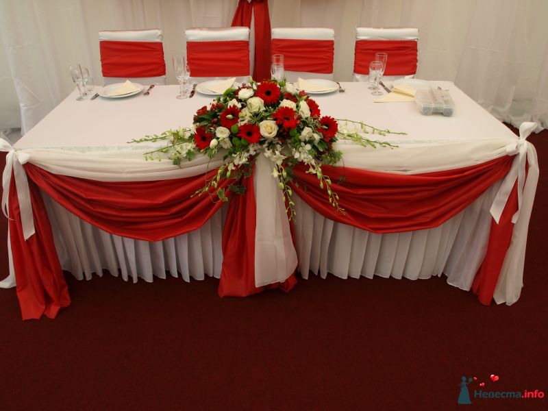 калі ты менавіта хочаш дабавіць чырвоны колер, то можна выкарыстаць макі, чырвоныя ружы, куставыя гваздзікі, чырвоных кветак шмат. Таму не ўзважыўшы ўсе яшчэ раз не трэба так адразу адмаўляцца, ўся рашаема. Вось глядзі які варыянт, праўда тут не зусім тое, аднак бачна як выглядаюць каляровыя напероны і белыя кветкі ў кампазіцыях.