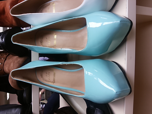 Кать, увидела сегодня а ЦУМе. На нижней фотке туфли ближе к зелёному, но каблук ниже. Первые -- чисто бирюзовые, а телефон поменял их цвет на голубой
