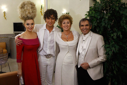 Праздник начался с яркого прибытия жениха и невесты на черном "Мерседесе". Молодожены оба были в белоснежных костюмах и сияли от счастья. На Прохоре были элегантные брюки, концертный фрак и рубашка, расшитая бисером. В свою очередь невеста прекрасно выглядела в легком, трикотажном платье цвета айвори. Нежные образ Копенкиной отлично гармонировал с шубой из голубой норки.