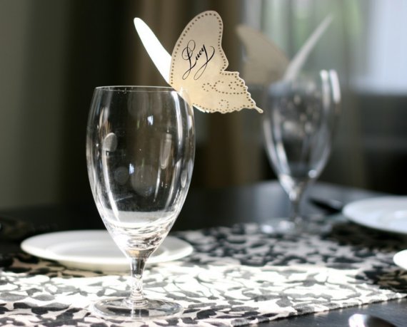 На счет рассадочных карточек - нравится вариант бабочек! Была на одной свадьбе, там у каждого на бокале висела фиолетовая бабочка (в цвет свадьбы) - так необычно было и красиво!