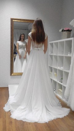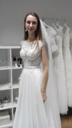 Разрешите и мне высказать своё мнение. Мне очень нравятся платья с таким ажурным верхом и лёгким воздушным низом, но в большинстве из них так сильно просвечиваются чашечки, что делают невозможным выбор такого платья. В вашем случае именно так и есть... симпатичное платье, но эти чашечки беспощадно бросаются в глаза... Где-то в списке салонов и моделей для примерки у меня была похожая модель. Не вспомню сейчас, где именно её насмотрела, но завтра, когда дорвусь до своего ноутбука, поделюсь, если нужно.